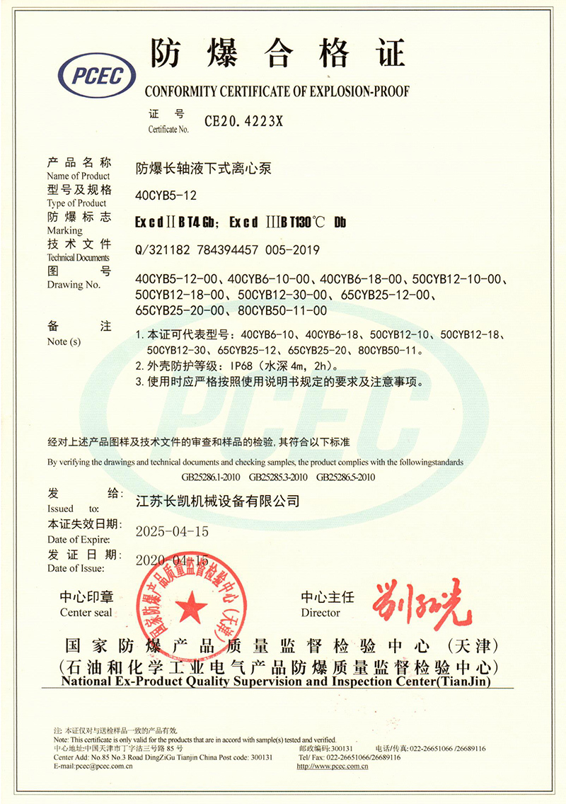 Explosion proof certificate submerged pump